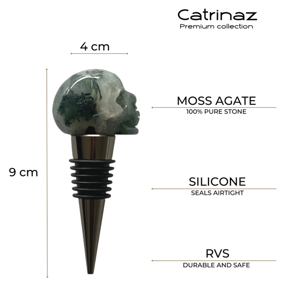 At Catrinaz® we only work with products of the highest quality. We take great care in the durability of our products. This stopper is made of stainless steel, safe and durable with a 100% natural moss agate natural stone.
