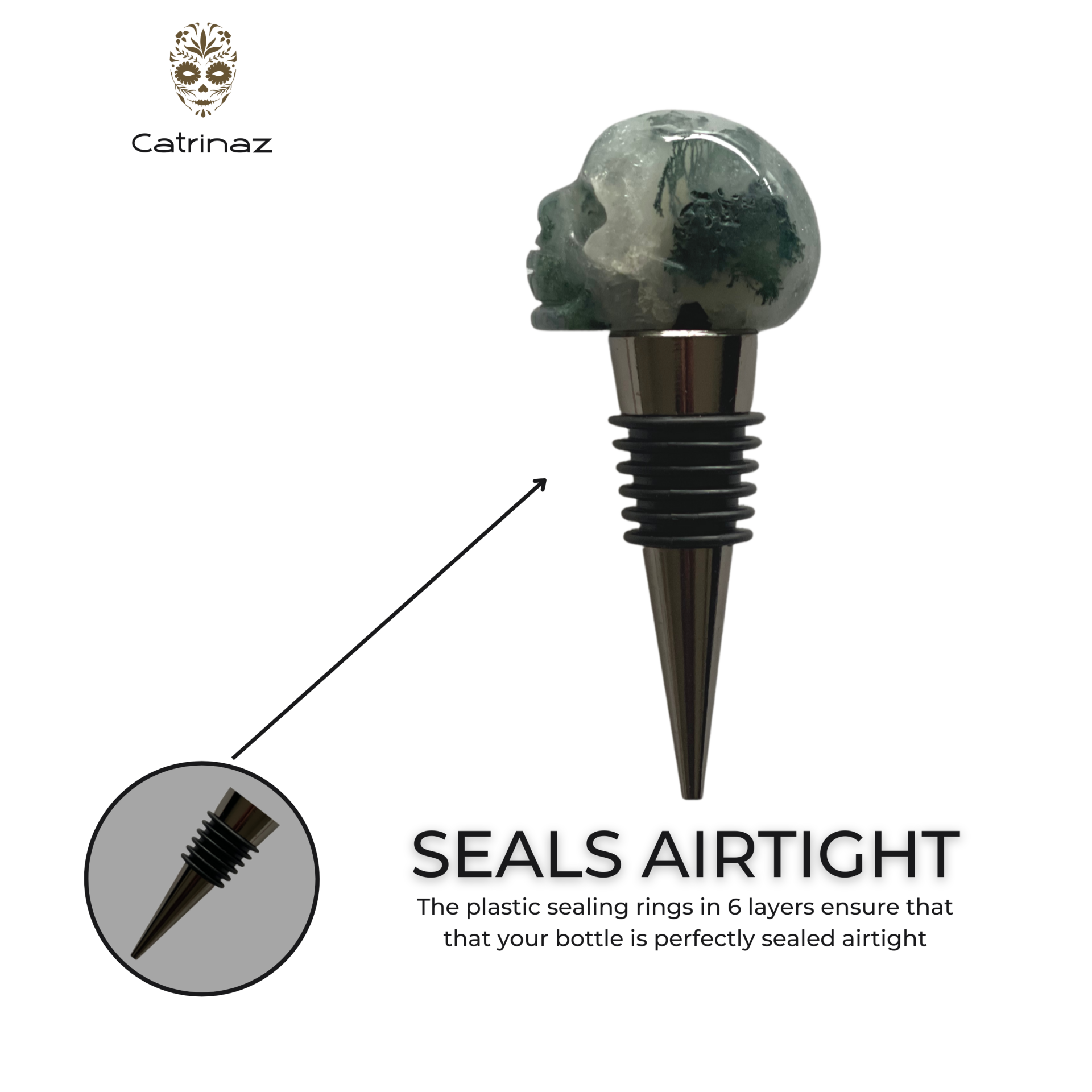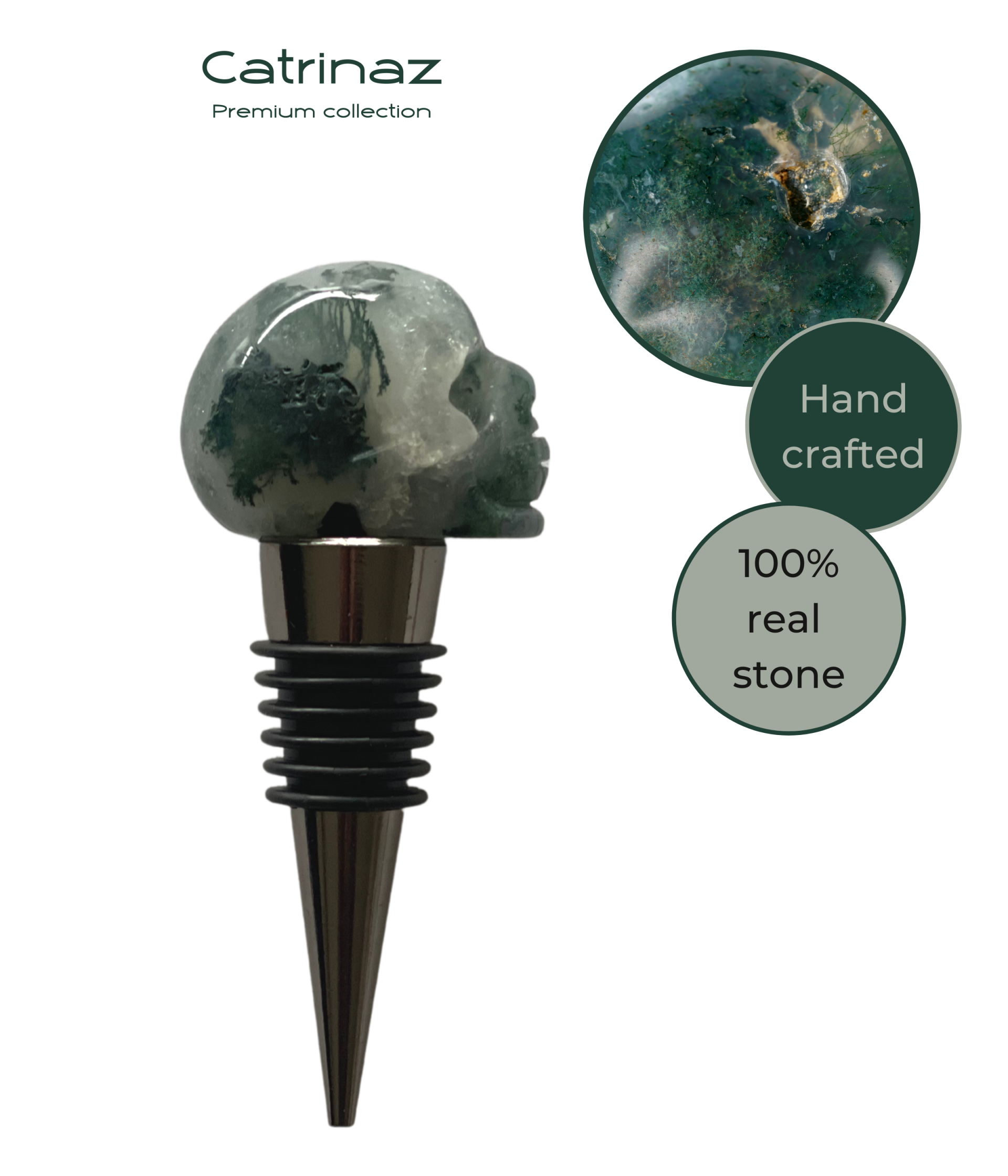 Catrinaz® - Premium bottle stopper with skull - Moss agate 100 % natural stone - Wine stopper - skull - Unique gift