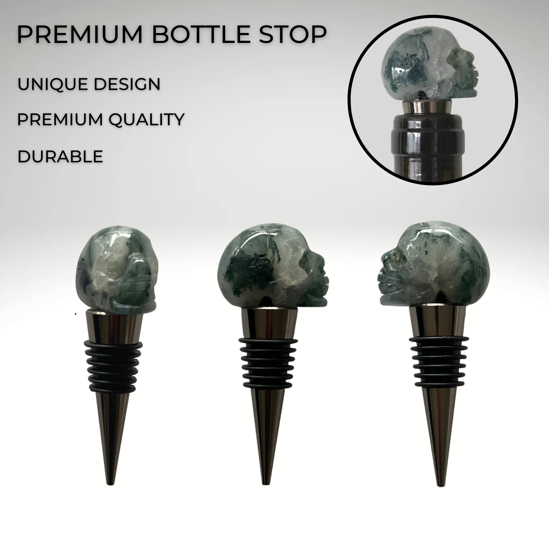 - 1 premium black bottle stopper with skull design in 100% natural moss agate natural stone