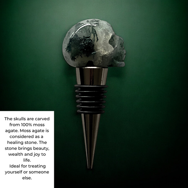 Give your favorite bottle from your bar cabinet or mancave an extra luxurious, unique and skully look? A stylish addition to your table? This bottle stopper with skull made of moss agate natural stone makes this true. This stopper is made of stainless steel, safe and durable with a 100% natural moss agate natural stone in skull shape. It is a must-have for lovers of a good bottle of tequila, whiskey, rum, wine,...? Are you that enthusiast and do you have an eye for detail? Then definitely try this unique bottle stopper!