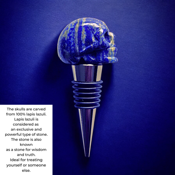 Give your favorite bottle from your bar cabinet or mancave an extra luxurious, unique and skully look? A stylish addition to your table? This bottle stopper with skull made of lapis lazuli natural stone makes this true. This stopper is made of staimless steel, safe and durable with a 100% natural lapis lazuli stone in skull shape. It is a must-have for lovers of a good bottle of tequila, whiskey, rum, wine,...? Are you that enthusiast and do you have an eye for detail? Then definitely try this unique bottle stopper!