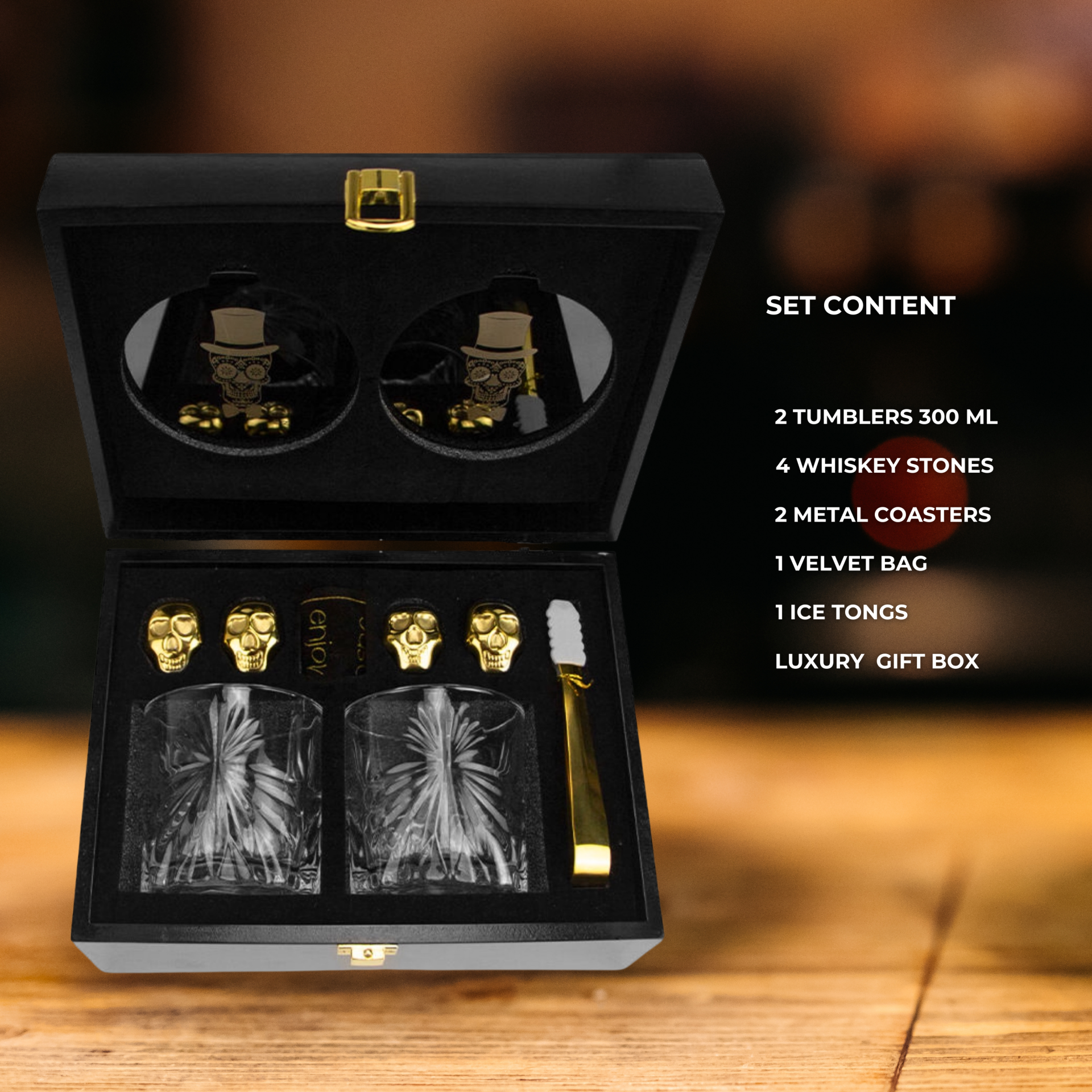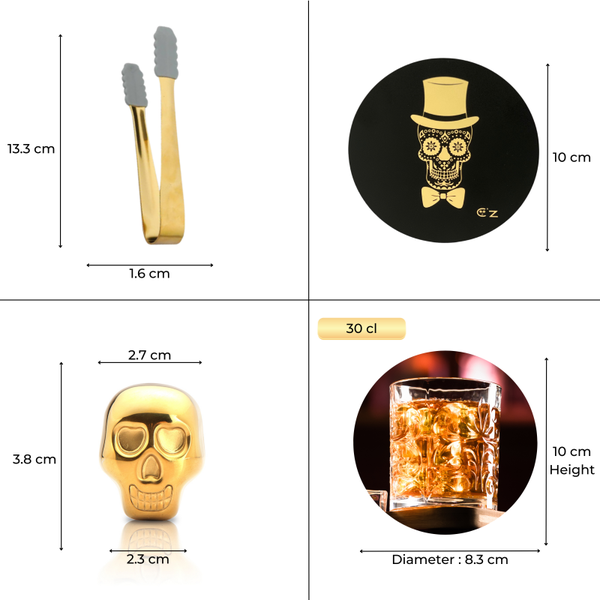 Catrinaz® - Luxury whiskey / spirit set - Incl. 2 premium tumblers 300 ml - 4 gold-colored stainless steel ice blocks in skull shape - 2 unique coasters - Velvet storage bag - Ice tong - Luxury gift box - Unique gift