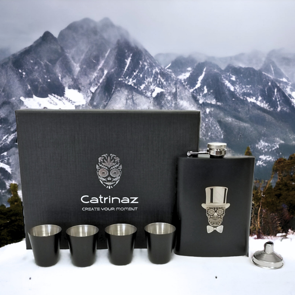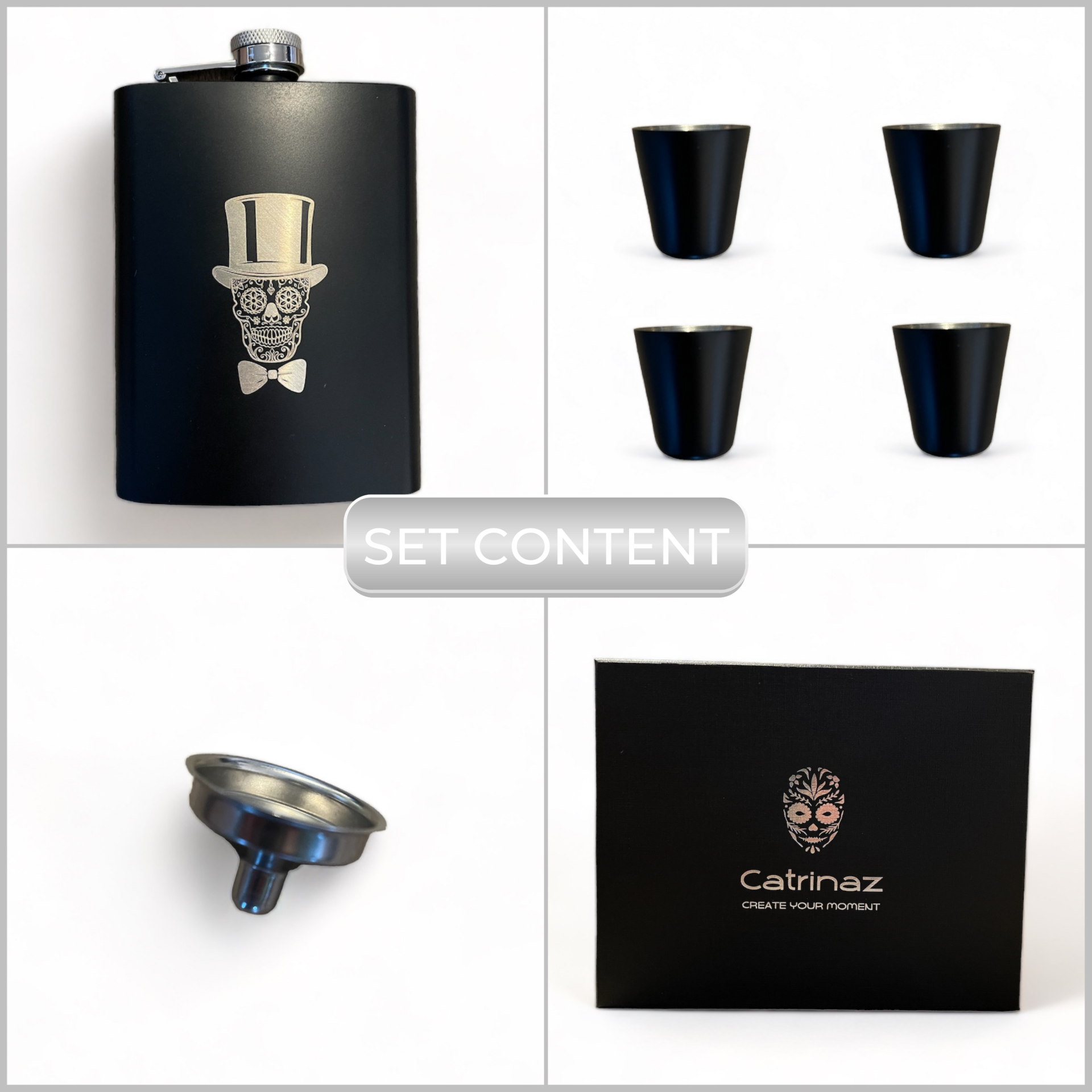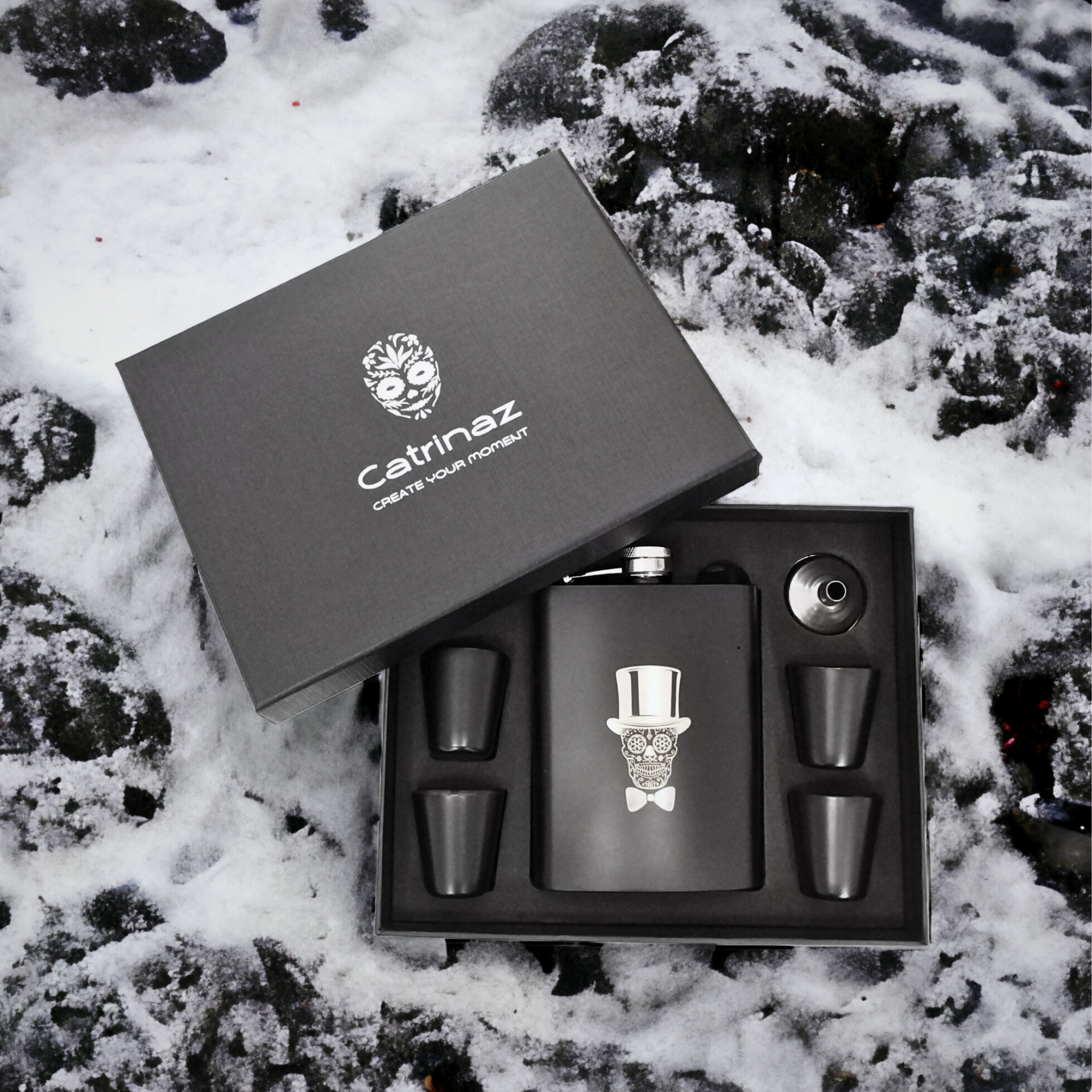 Catrinaz® hip flask - Pocket flask - Unique skull design - Matte black - Platvink - Stainless steel - 4 Shot glasses - Luxury gift box - Gift for man