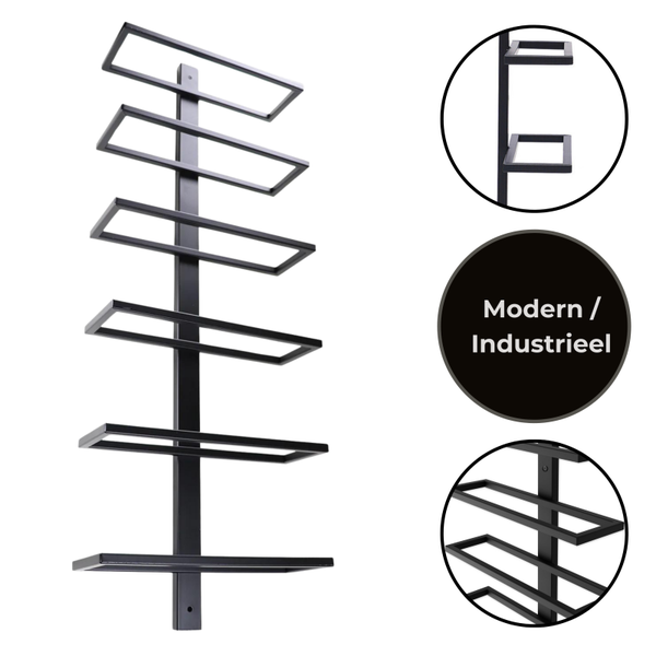 •This black steel wine rack is perfect for your favorite wines. •With this wine rack you are assured of a stylish and sturdy product. •You can easily attach the wine rack to the wall, saving space. •The wine rack has enough capacity for 6 bottles, ideal for small collections. •You can also hang different racks next to each other Impress your guests with this modern and trendy wine rack. •The matte black design fits perfectly with any interior style. •With this wine rack you always have your favorite wines within reach. •The wine rack is made of high-quality steel and is therefore very durable, a worthwhile investment.