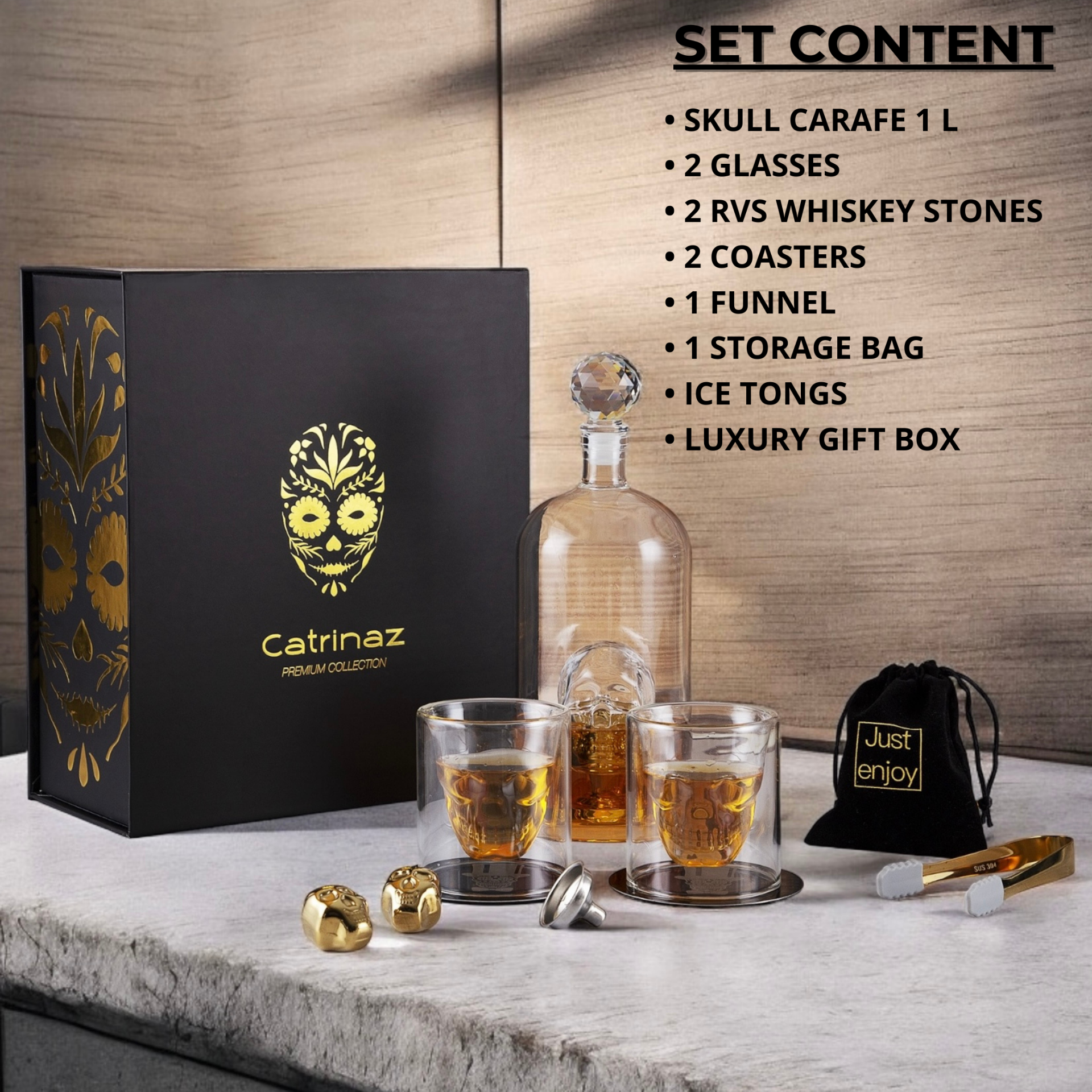 Catrinaz® Luxury Whiskey set - Skull design - Whiskey carafe - tequila carafe - 1L - Incl. 2 golden skull whiskey stones - 2 whiskey glasses - 2 coasters - Unique gift - Luxury gift box - Gift for man