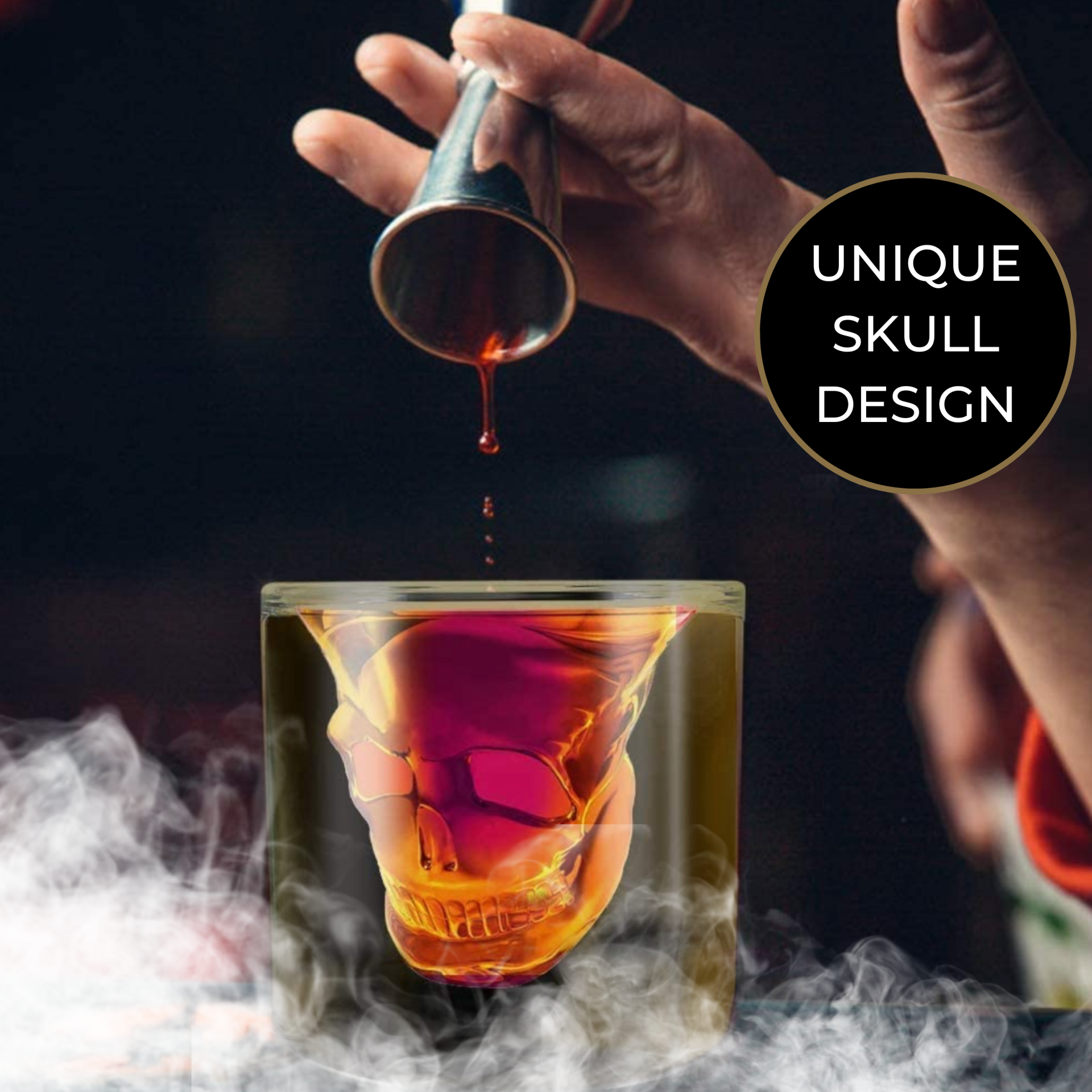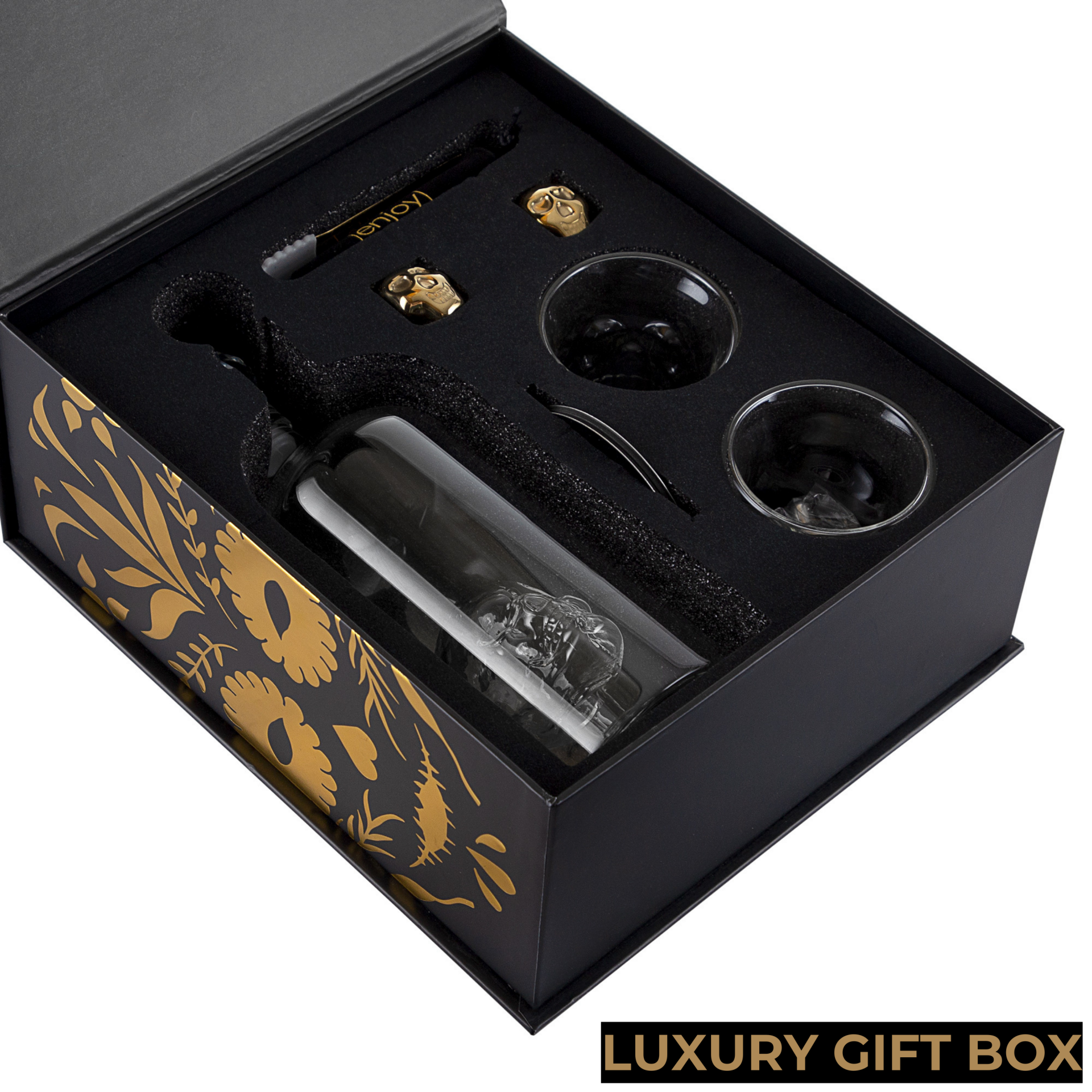 Would you like to upgrade your bar cabinet with this incredibly handsome and cool decanter with a unique skull design? This luxurious carafe will undoubtedly be the eye-catcher in your interior. With its unique skull design, this decanter is a real must-have for lovers of tequila, whiskey, rum and other spirits. Made of high-quality hand-blown glass, this decanter should certainly not be missing in your cupboard or man cave. The unique glasses, coasters and gold-colored stainless steel ice blocks in skull shape complete this set. Packaged in a beautiful luxurious gift box, this set is also ideal as a gift!