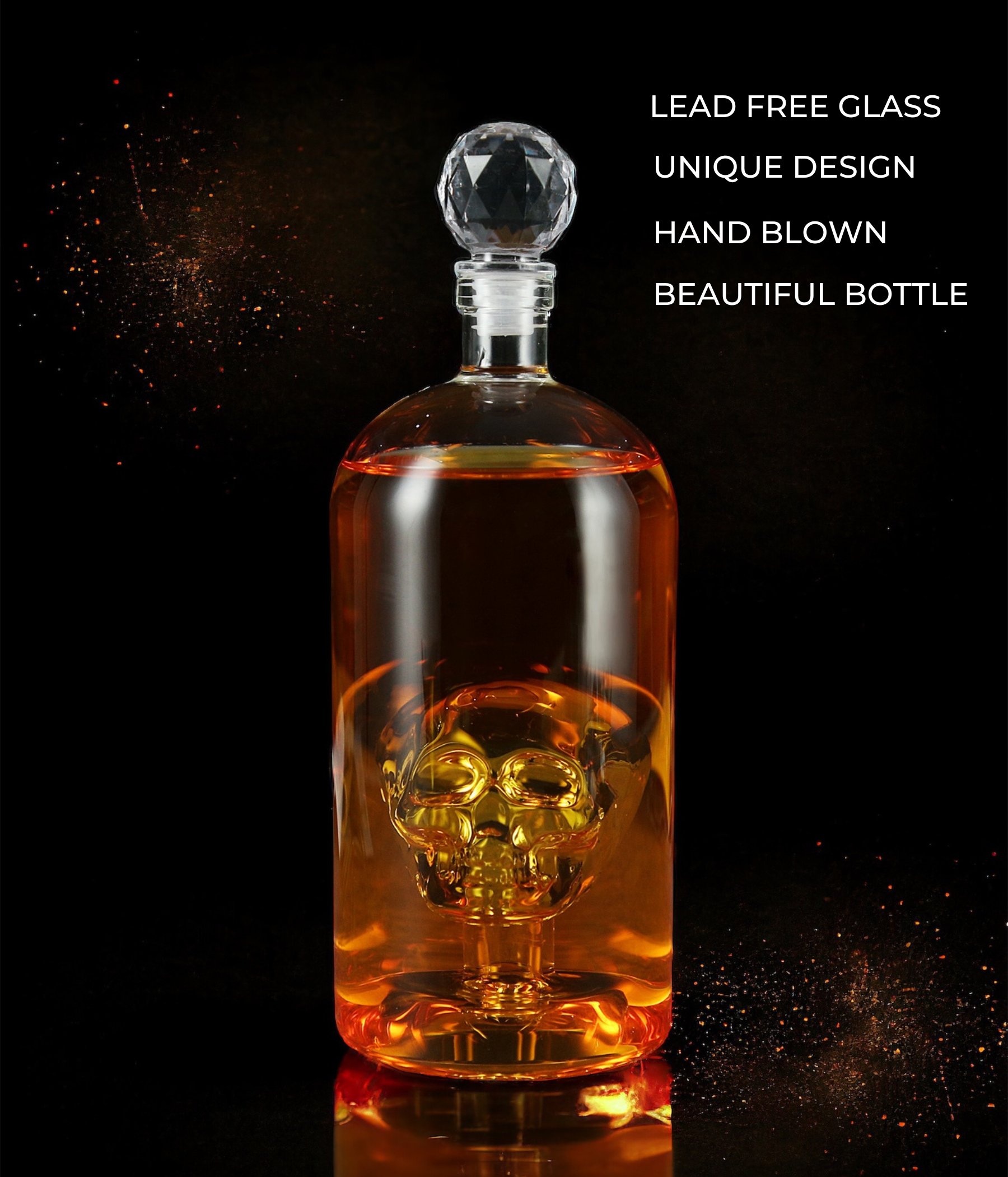 Upgrade your bar cabinet with this incredibly handsome and cool decanter with unique skull design? This carafe will undoubtedly become the eye-catcher in your interior. With its unique skull design, this decanter is a real must-have for lovers of tequila, whiskey, rum and other spirits. Made of high-quality hand-blown glass, this carafe should certainly not be missing in your cupboard or mancave. Packed in a luxurious gift box, this carafe is also very suitable as a gift!