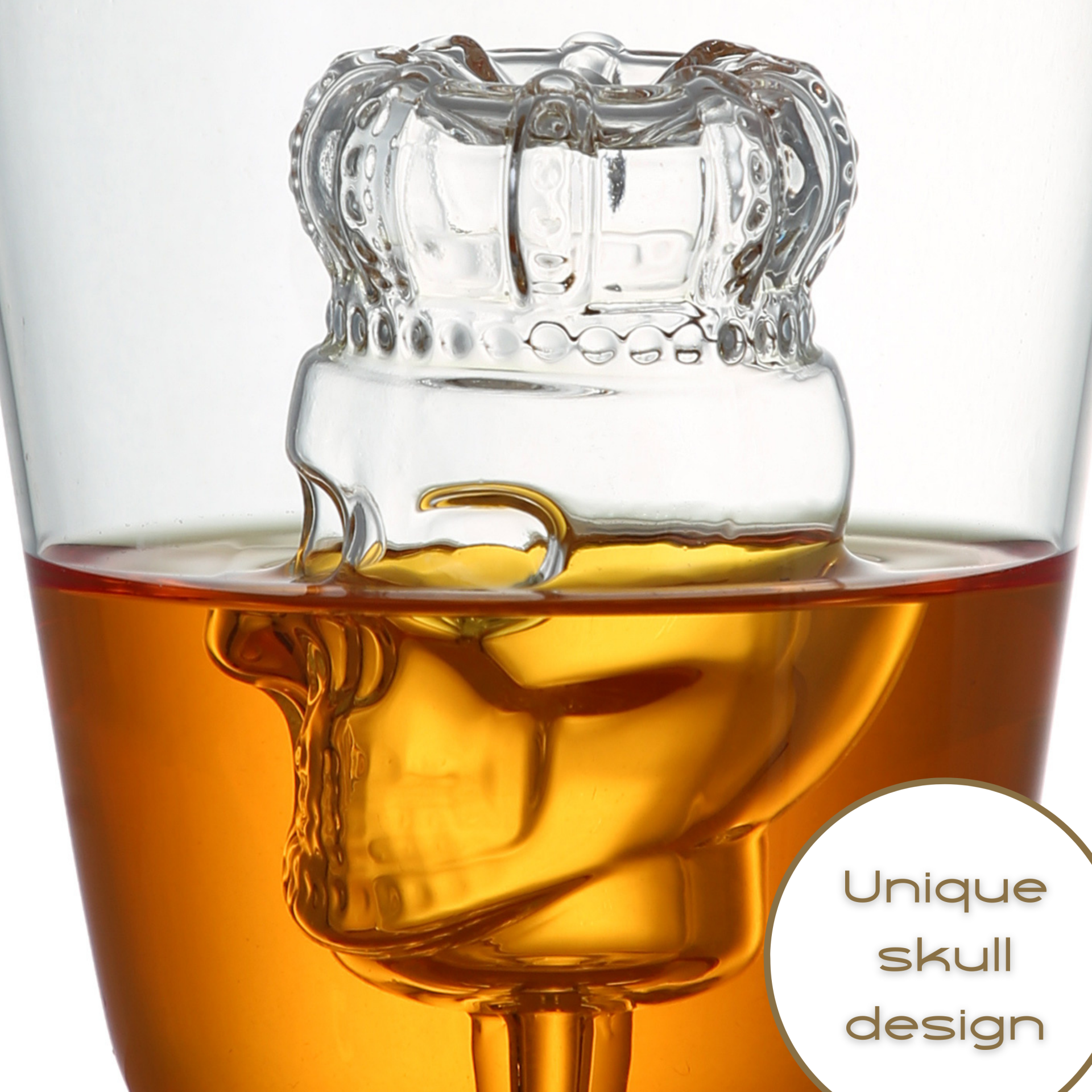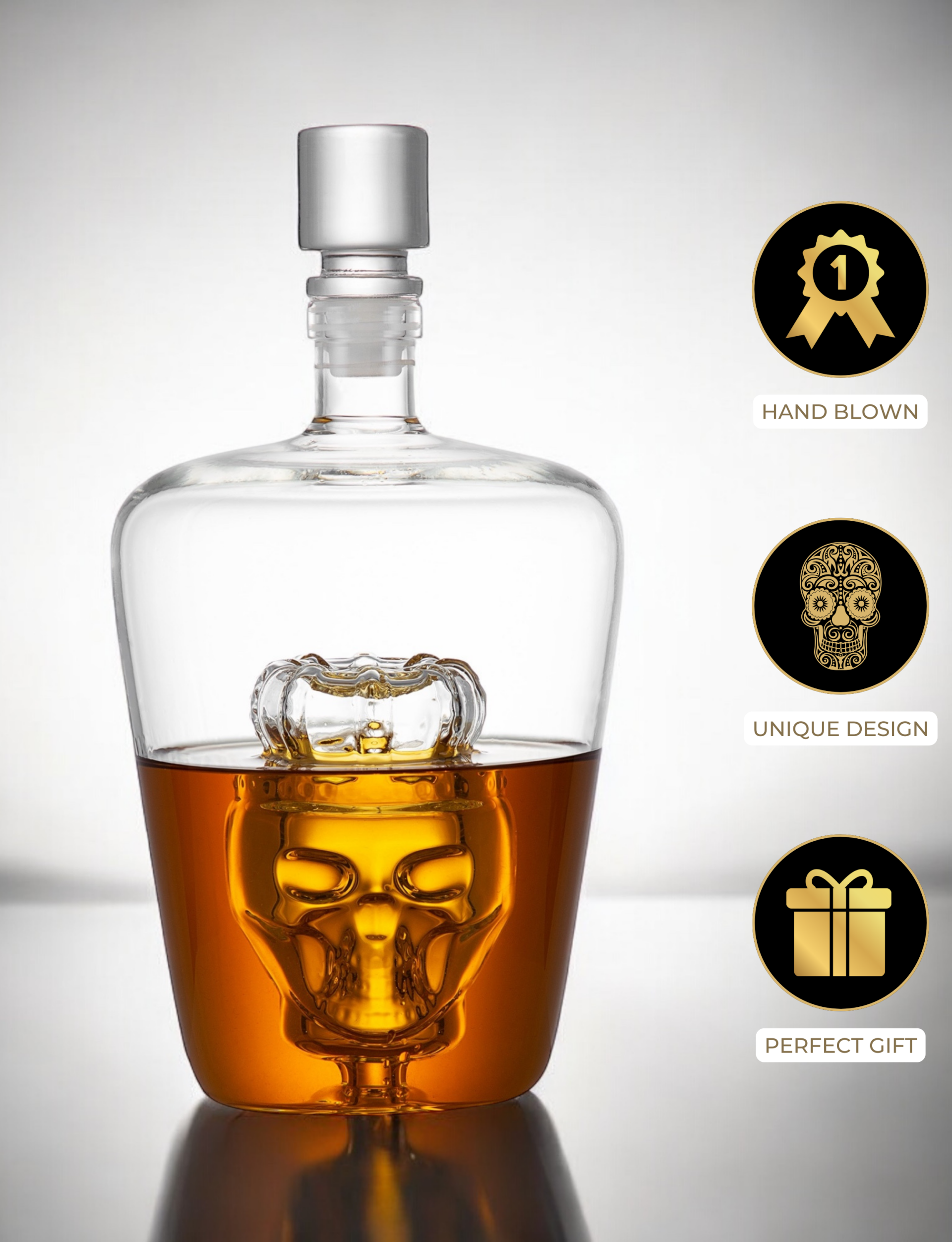 Upgrade your bar cabinet with this incredibly handsome and cool decanter with unique skull design? This carafe will undoubtedly become the eye-catcher in your interior. With its unique skull design, this decanter is a real must-have for lovers of tequila, whiskey, rum and other spirits. Made of high-quality hand-blown glass, this carafe should certainly not be missing in your bar or mancave. Packed in a luxurious gift box, this carafe is also very suitable as a gift!
