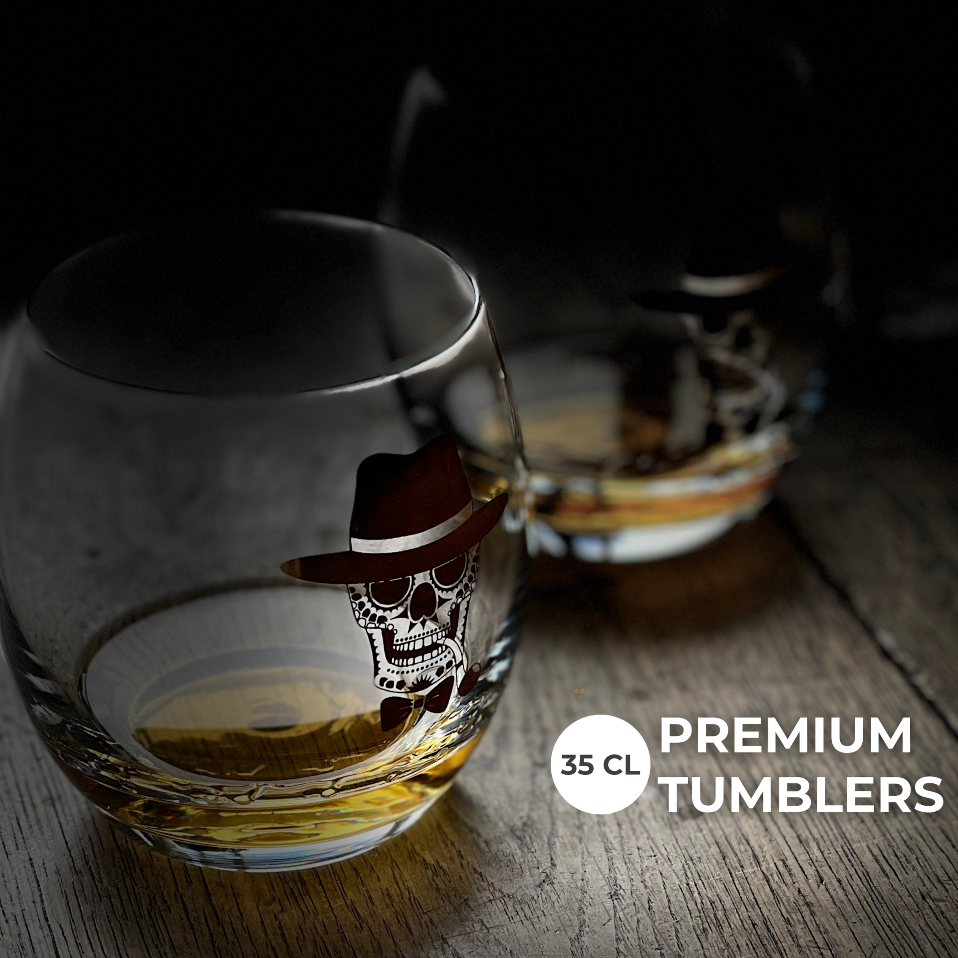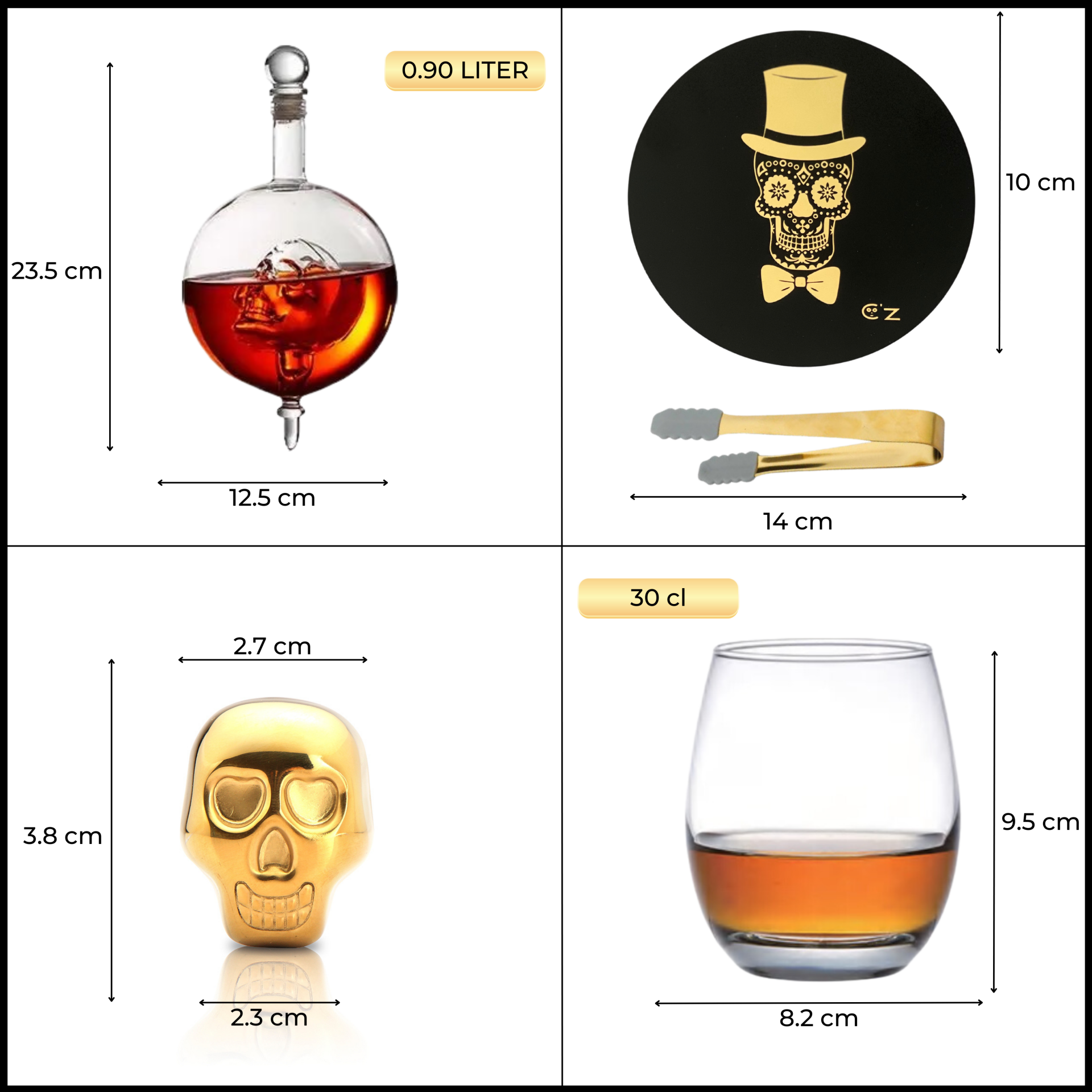 Would you like to upgrade your bar cabinet with this incredibly handsome and sturdy decanter with unique skull design? This luxurious carafe will undoubtedly become the eye-catcher in your interior. With its unique skull design, this decanter is a real must-have for lovers of tequila, whiskey, rum and other spirits. Made of high-quality hand-blown glass, this carafe should certainly not be missing in your cupboard or mancave. The unique tumbler / whiskey glasses, skully coasters, and gold-colored stainless steel ice blocks in skull shape make this set complete. Packed in a beautiful gift box, this set is also very suitable as a gift!