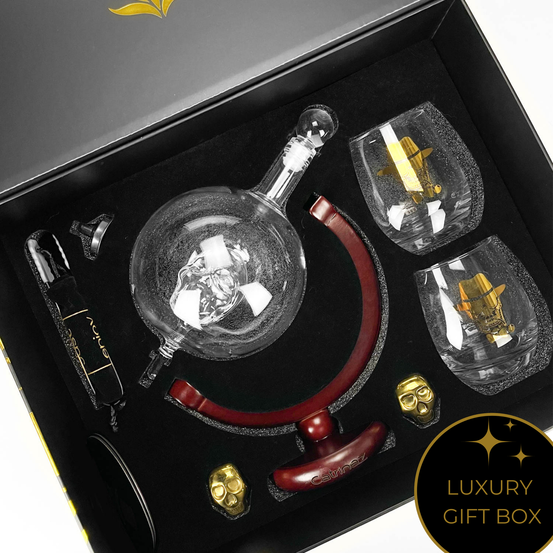 Catrinaz® - Luxury decanter set in skull design - 0.9 L - Incl. 2 gold colored stainless steel ice blocks in skull shape - - 2 unique tumbler glasses - 2 unique coasters - Unique gift