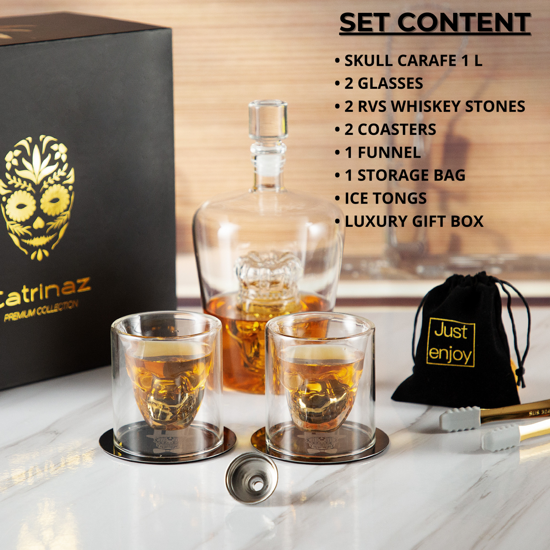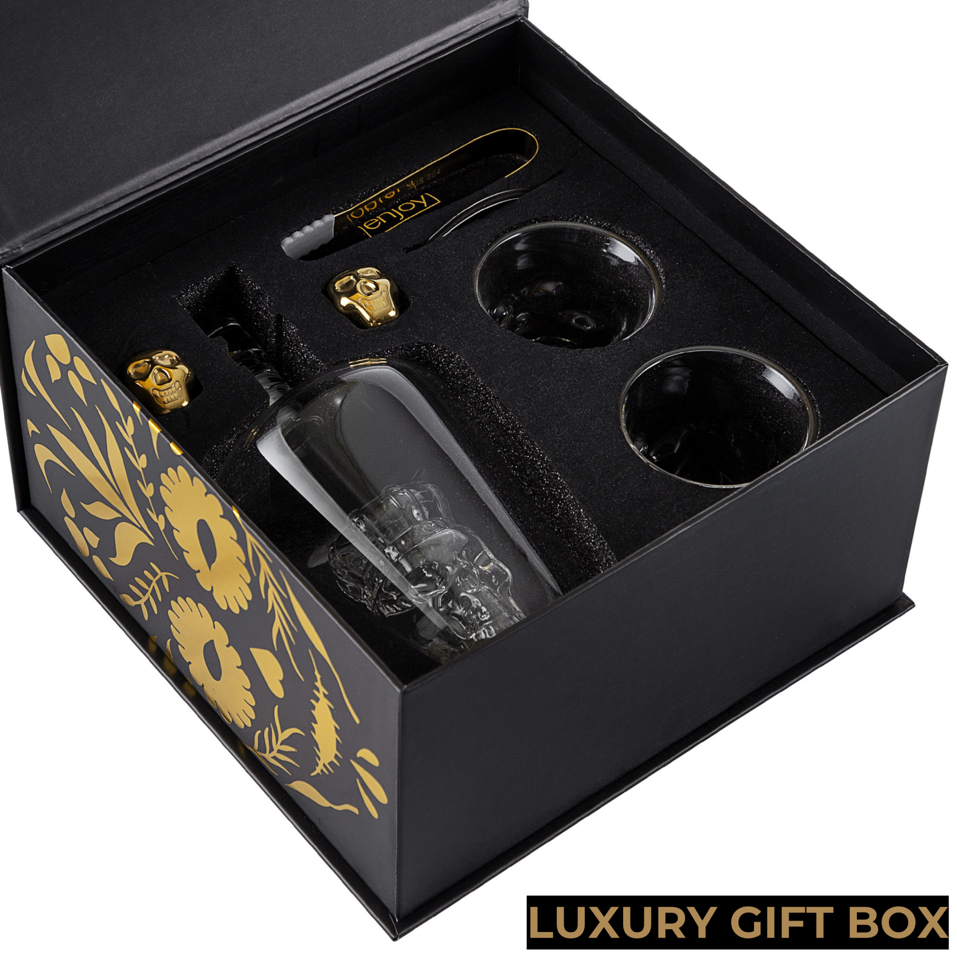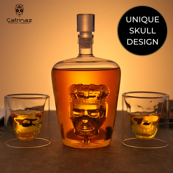Would you like to upgrade your bar cabinet with this incredibly handsome and sturdy decanter with unique skull design? This luxurious carafe will undoubtedly become the eye-catcher in your interior. With its unique skull and crown design, this decanter is a real must-have for lovers of tequila, whiskey, rum and other spirits. Made of high-quality hand-blown glass, this carafe should certainly not be missing in your cupboard or mancave. The unique glasses, skully coasters and gold-colored stainless steel ice blocks in skull shape make this set complete. Packed in a beautiful luxury gift box, this set is also very suitable as a gift!
