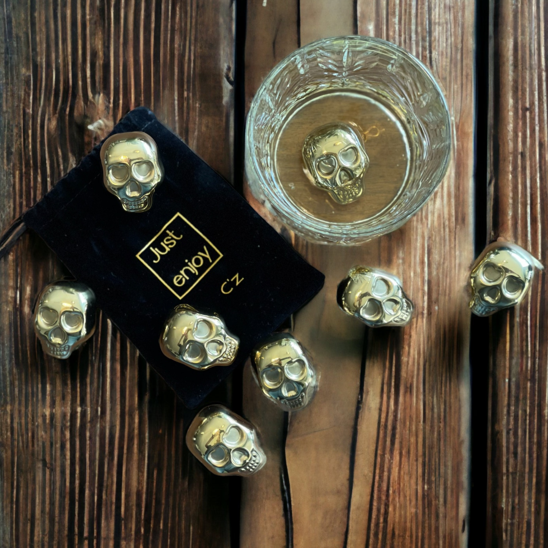 Catrinaz® - Luxury skull whiskey stones - Tequila stones - stainless steel - 8 pieces - Gold color - Unique design - Reusable ice cubes - Velvet storage bag