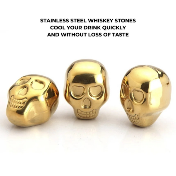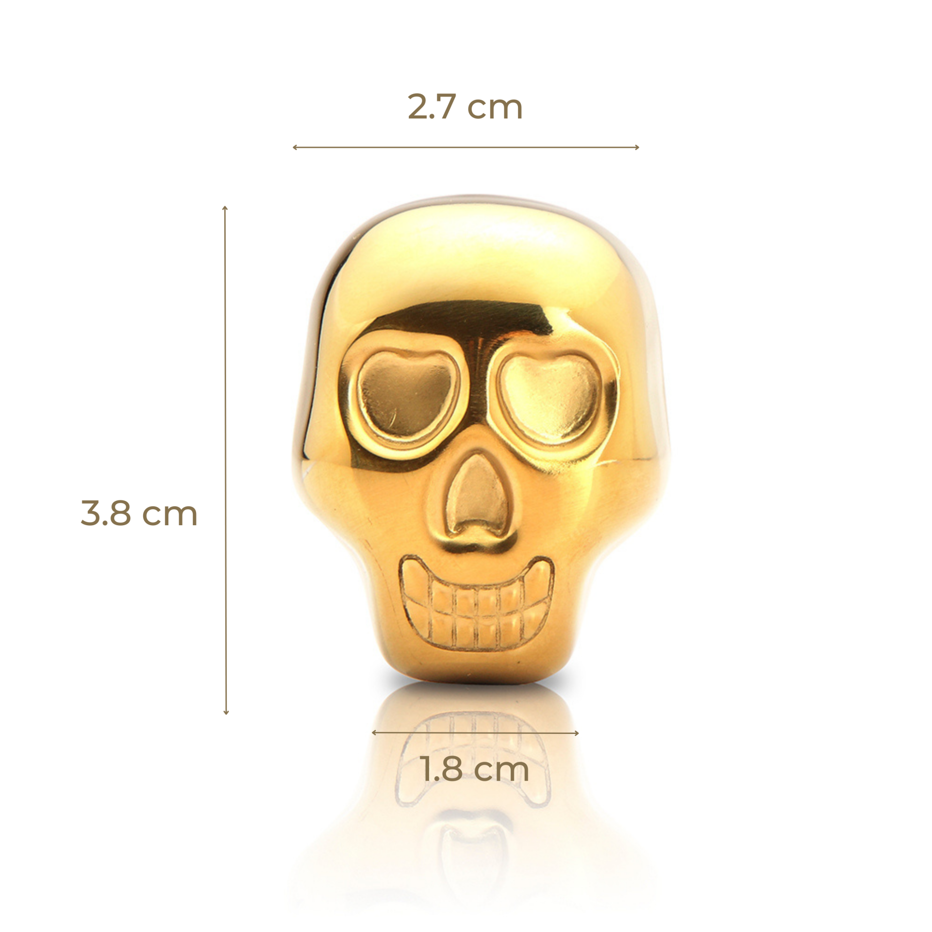 Far too often, plain ice blocks impart a flavor and water down your drink. This is a thing of the past with stainless steel whiskey stones. These luxurious stainless steel ice cubes do not melt, do not give off any taste and provide a unique touch in your glass due to the golden skull design. The perfect "on the rocks"